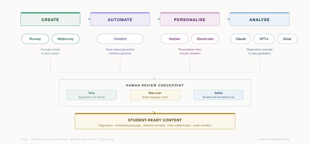 The platform’s visual system, onboarding content, pilot outreach, and diagnostic copy were all built using a structured generative AI pipeline; a documented sequence with human review at the critical junction before anything reached a student.
