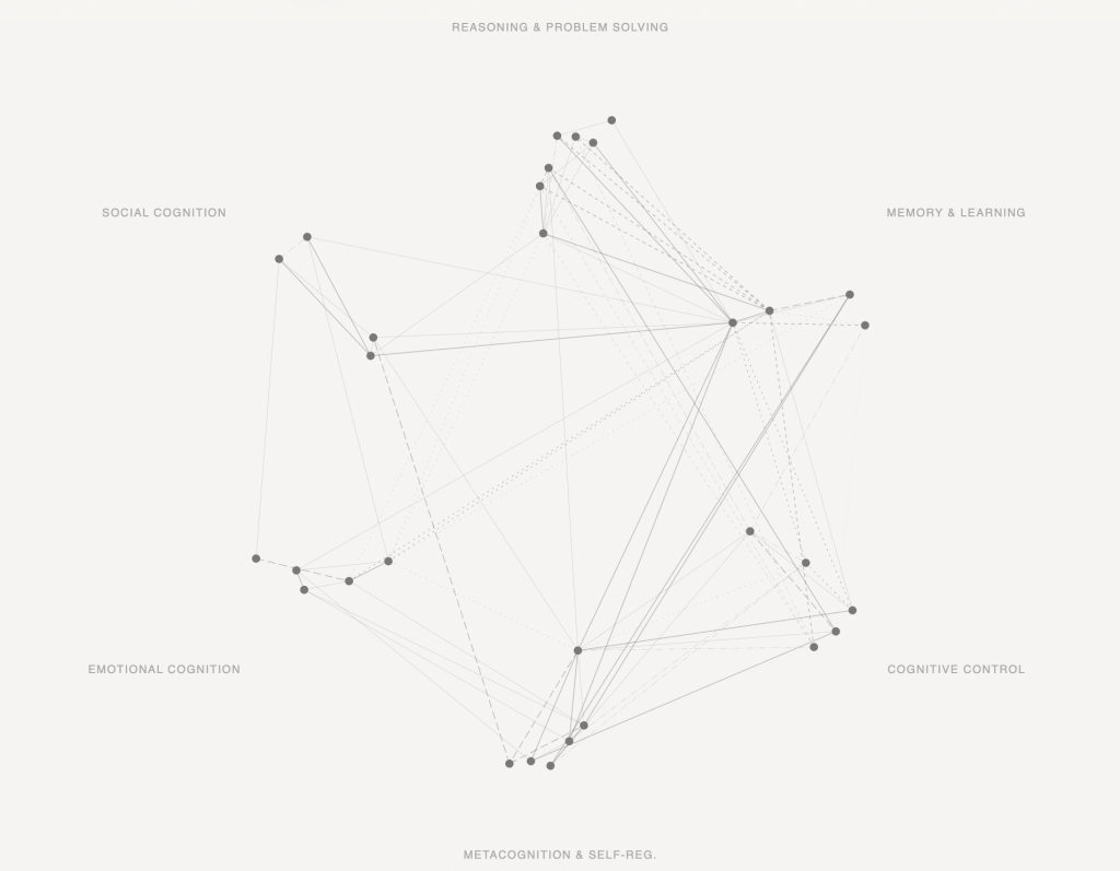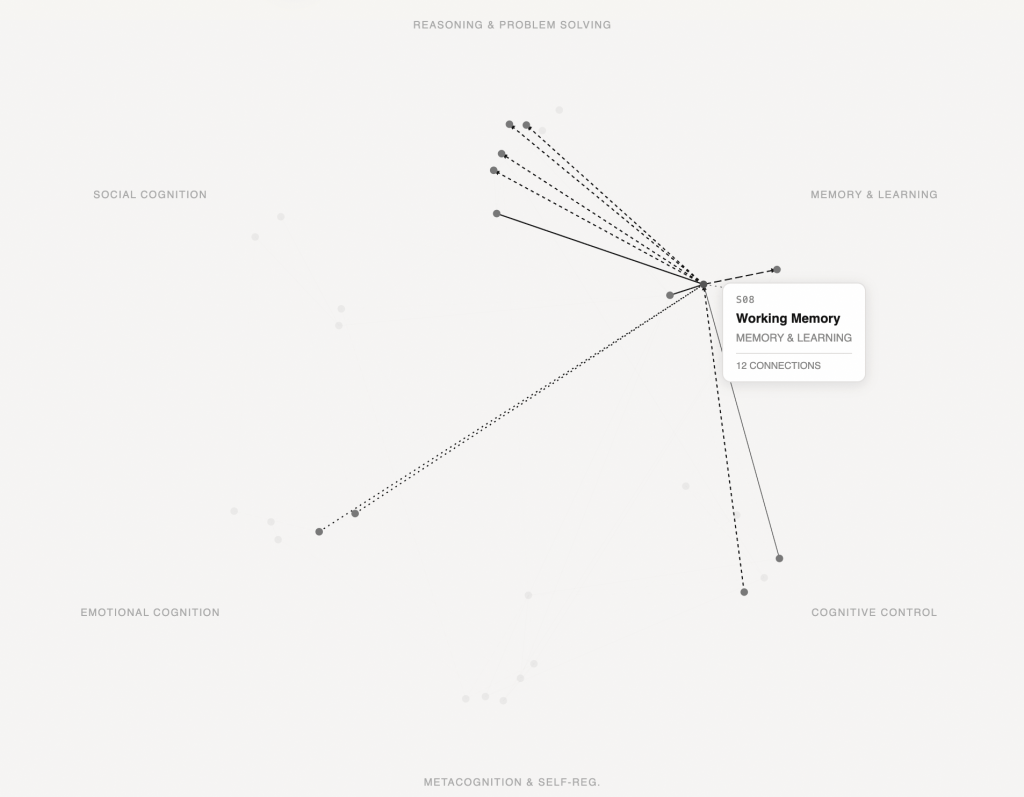 A science-grounded profile derived from diagnostic signals, mapping a learner across six cognitive domains and their interdependencies. The map is built across three tiers anchored in the research literature: