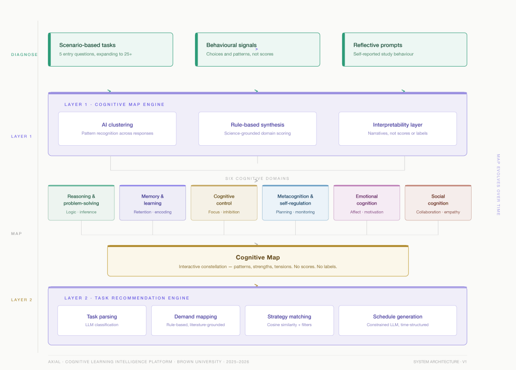 An AI-powered cognitive profiling platform that maps how people think and converts those patterns into task-specific study strategies; built from scratch at Brown University with faculty collaborators from Brown and Harvard.