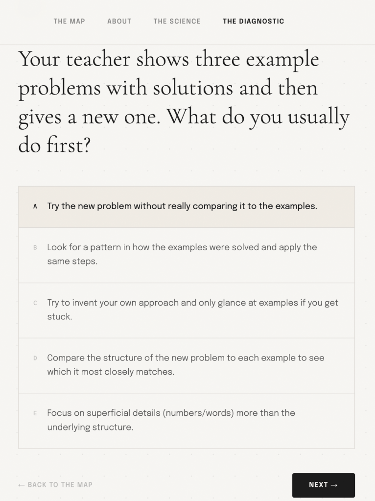 The diagnostic is short and approachable at entry: 5 scenario-based questions, expanding to 25+ for deeper profiling. It is explicitly not a personality test or an IQ test. Questions are framed as realistic study scenarios and behavioural choices, not correctness tasks.