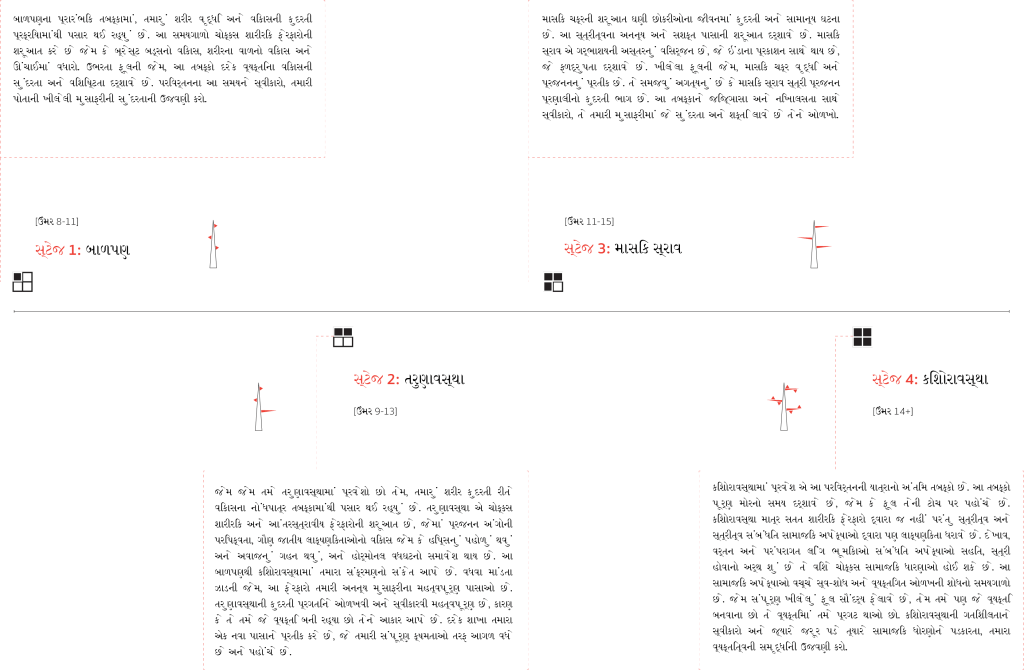 Utilize simple geometric graphics to visually convey the transformative journey of girlhood through adolescence, emphasizing key physical changes, hormonal milestones, and societal expectations at each stage. Section 1 of the interactive visualization aims to provide a clear and engaging representation of the menstrual cycle and its association with individual growth. I used subtle, minimalist symbols for the pop-up to ensure that the girls don’t feel shy trying to interact with the graphic (Note: the original text is in Gujarati, as shown in image 3).