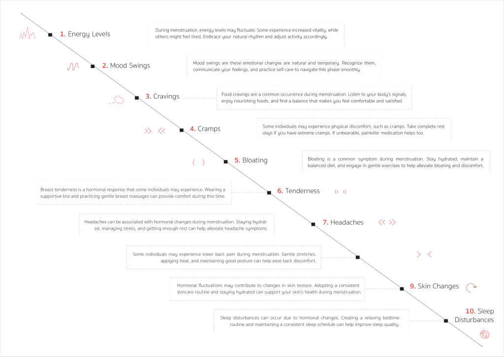 This section aims to provide a visual journey through the common symptoms of menstruation, fostering understanding and empathy while encouraging open conversations about these natural experiences. The expanded text also offers possible ways to calm extreme symptoms to avoid feelings of discomfort.