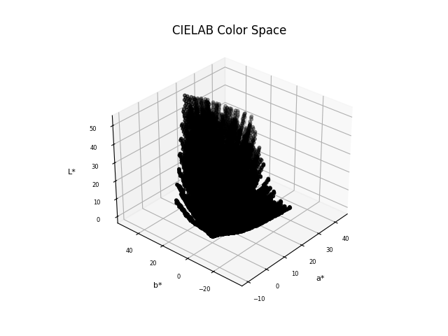 The machine learning model from step 1 attempts to algorithmically quantify chemical changes from pigment to color. Now, I use existing HEX values and generated HEX values for 100000 color formulae to map the color algorithm onto a CIELa*b* vector space: