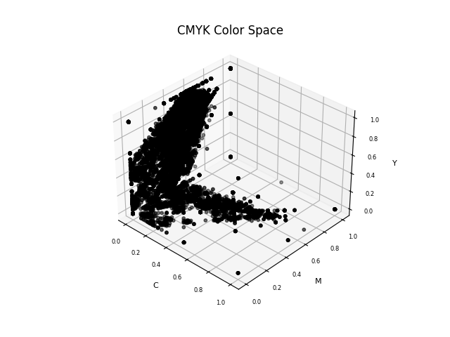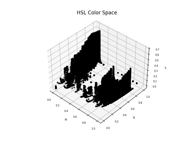The existing HEX codes are then converted to CMYK, HSL, and CIELa*b* using the Python script here and visualized using Matplotlib: