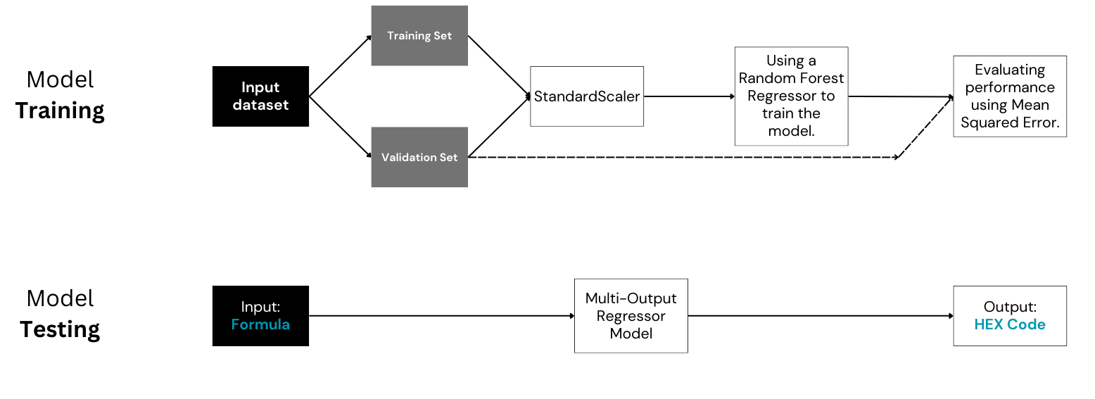 The first step is training a machine learning model to accurately predict a HEX code for any input color formula that has mixing ratios for: Black, Brown, Blonde, Clear, Red, Blue, Yellow, pH Booster, Dev strength, and Dev ratio as input pigments. The dataset comprises 29,000 formulations with specific ingredient ratios. My approach involves a MultiOutputRegressor model, addressing the interdependence of Red (R), Green (G), and Blue (B) channels in HEX codes.