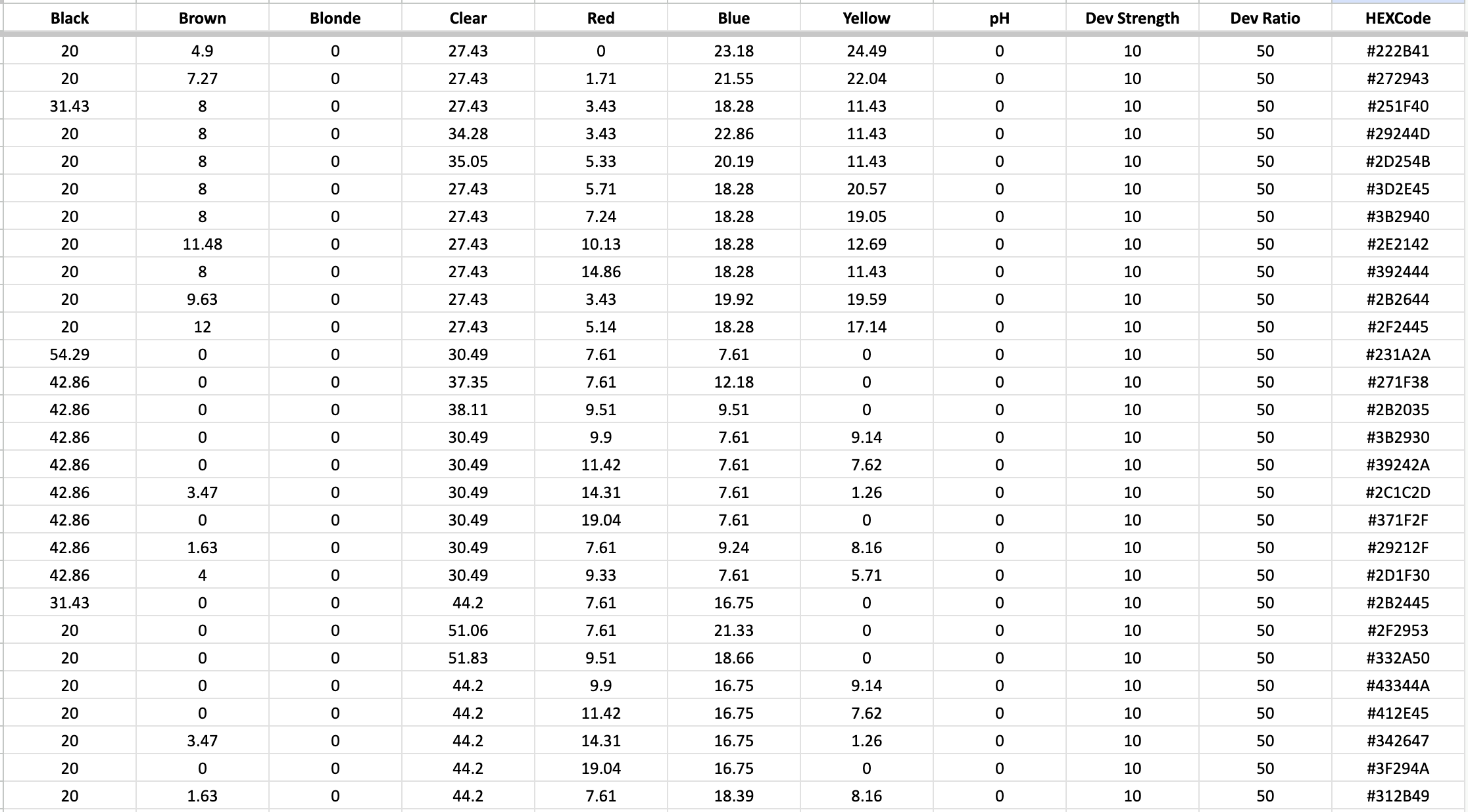 The dataset underpinning this endeavor is a comprehensive repository of 29,000 formulations, each uniquely defined by specific ratios of seven primary hair color ingredients: Black, Brown, Blonde, Clear, Red, Blue, and Yellow. To elevate predictive accuracy, the project employs an advanced MultiOutputRegressor, utilizing a linear regression base estimator to forecast HEX codes for each unique formulation. The model uses Kubelka-Munk equations for training, which aim to provide a more accurate physical representation of the pigment in the real world, beyond the confines of a purely digital RGB mix. This becomes especially significant in the context of hair color variation when subjected to physical application with additional chemicals such as oxidants and ammonia.