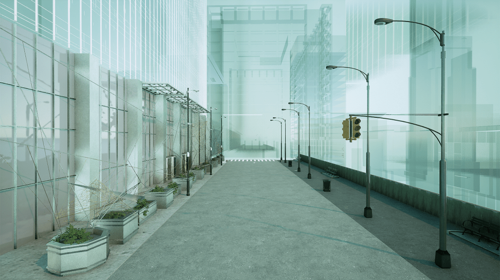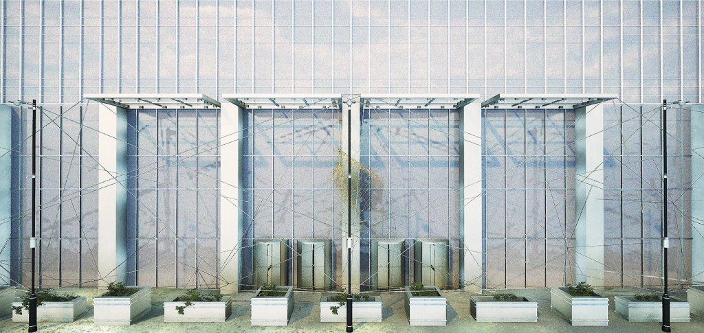 These visualizations show the architectural intervention as a streetside extension to JP Morgan’s 25 Bank Street site in Canary Wharf. The views show aluminum pipes (phase 1), elastic cables (phase 2), copper wire and data nests (phase 3), coordinate nodes, and seating shards at different times of the day.