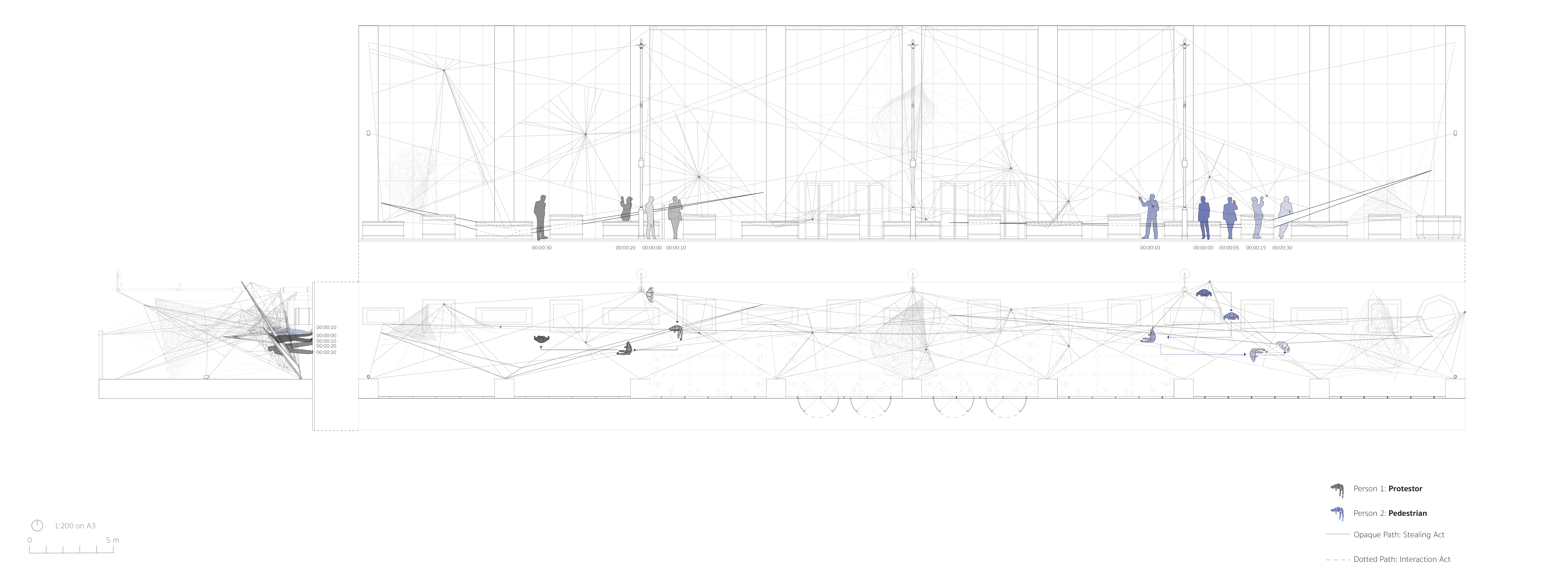 The plan, front elevation, and right elevation on this unfolded drawing show a time-based interaction between pedestrians and protestors within the same architectural intervention.