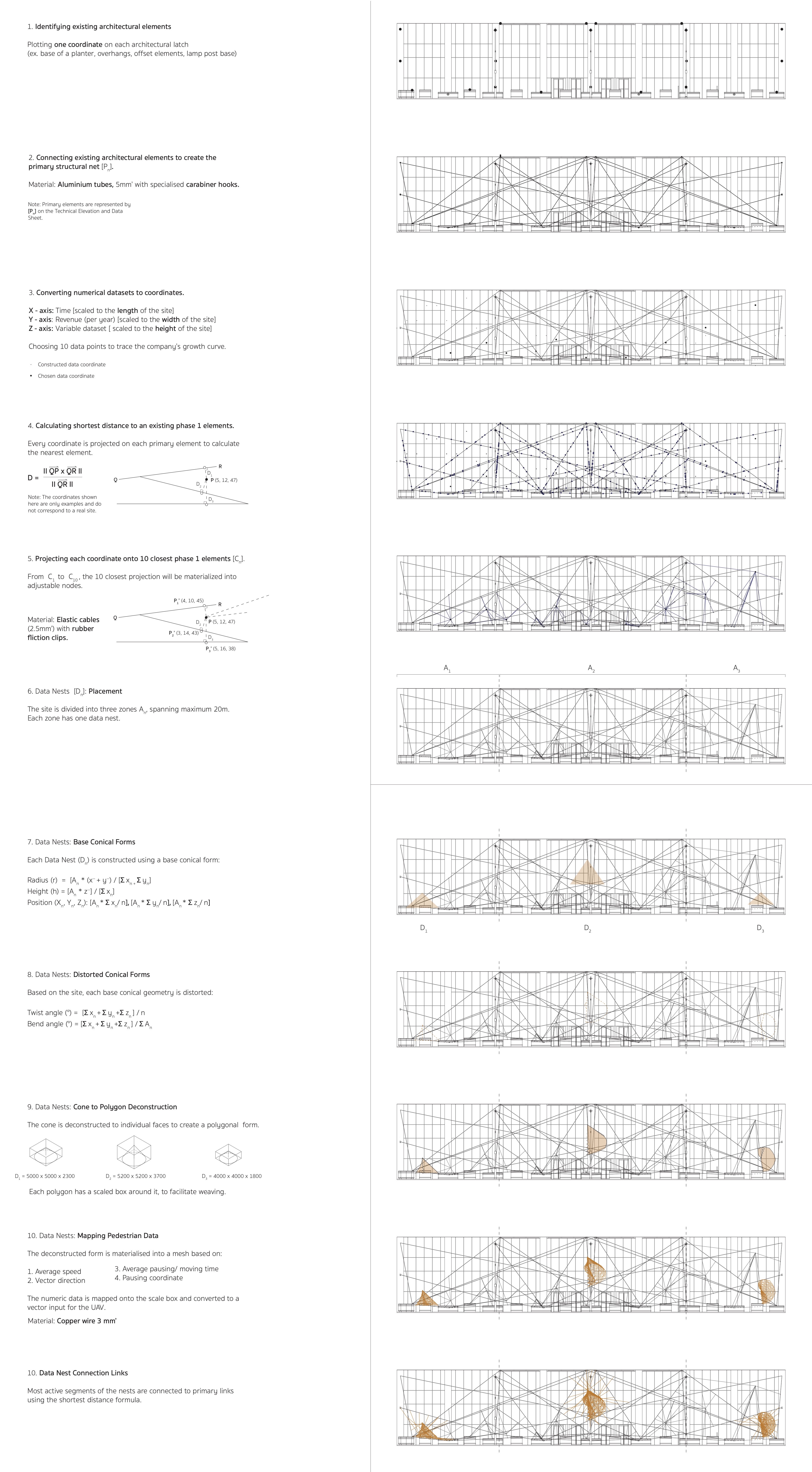 Phase 3 is context-specific, which dynamically weaves data nests using copper wire, based on pedestrian circulation on the site.