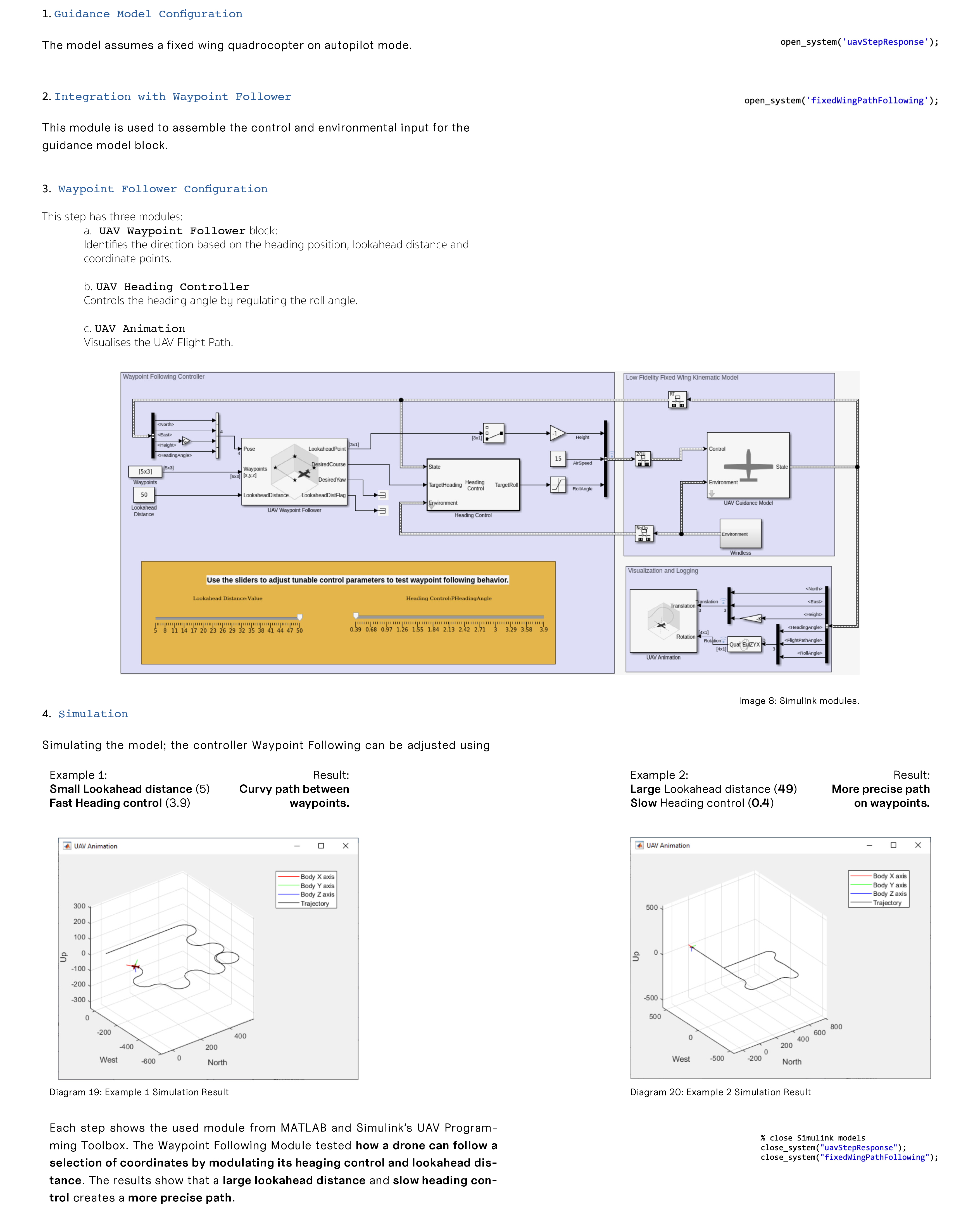 This test simulates waypoint following to see how a UAV path can be simulated by outlining specific points in its path. The code creates a controller that helps a UAV follow points to create its path. The code is simulated in Simulink.