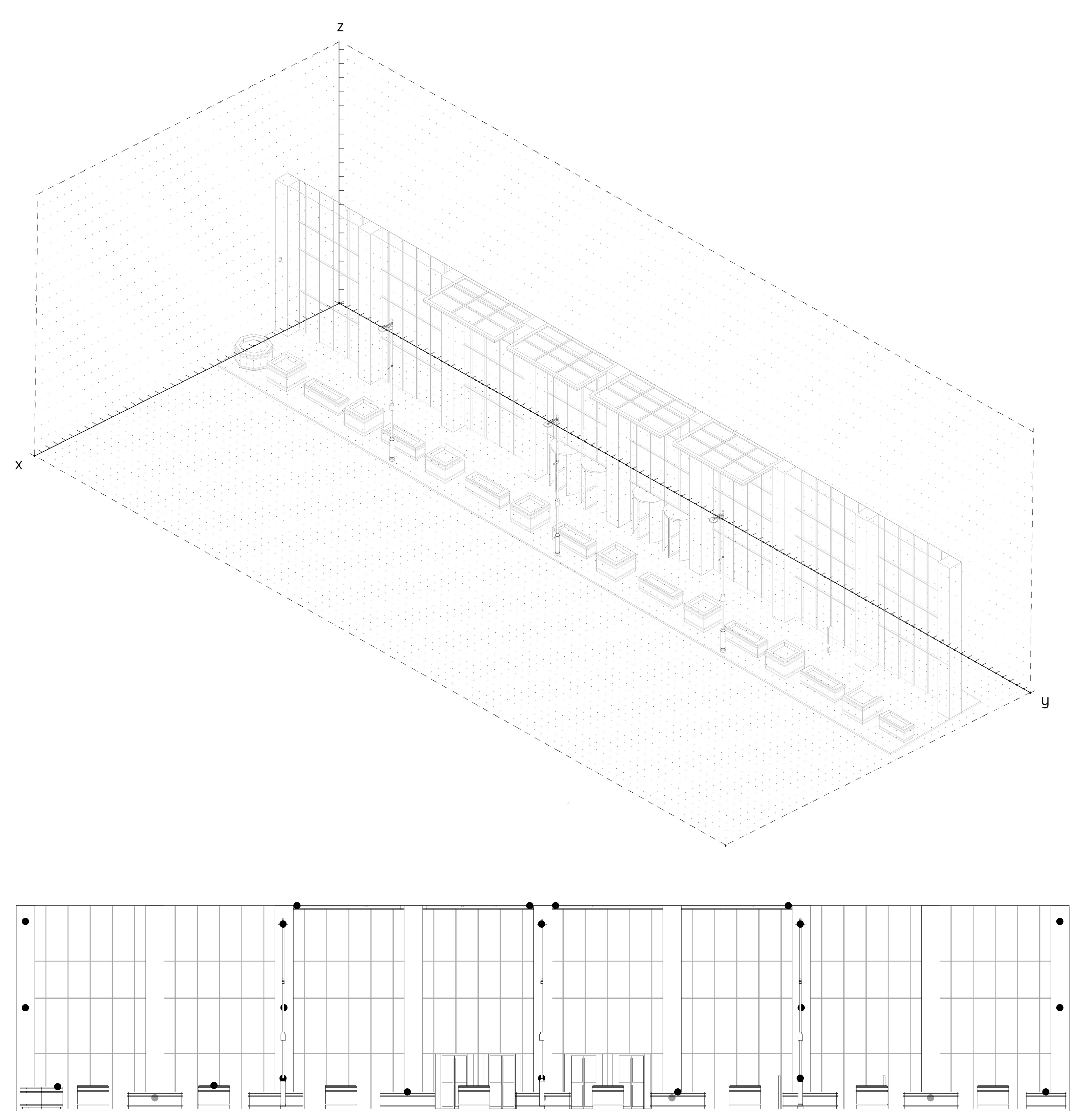 The REWIRE algorithm converts any numerical data to a spatial intervention on a given site. The data is modulated, mapped, and translated onto the site using vector coordinates, which are materialized into a spatial artifact by UAVs. The site is first converted into a 3D cartesian coordinate grid. Next, the UAV scans the site identifies architectural latches, outlined on previous pages, and extracts coordinates.