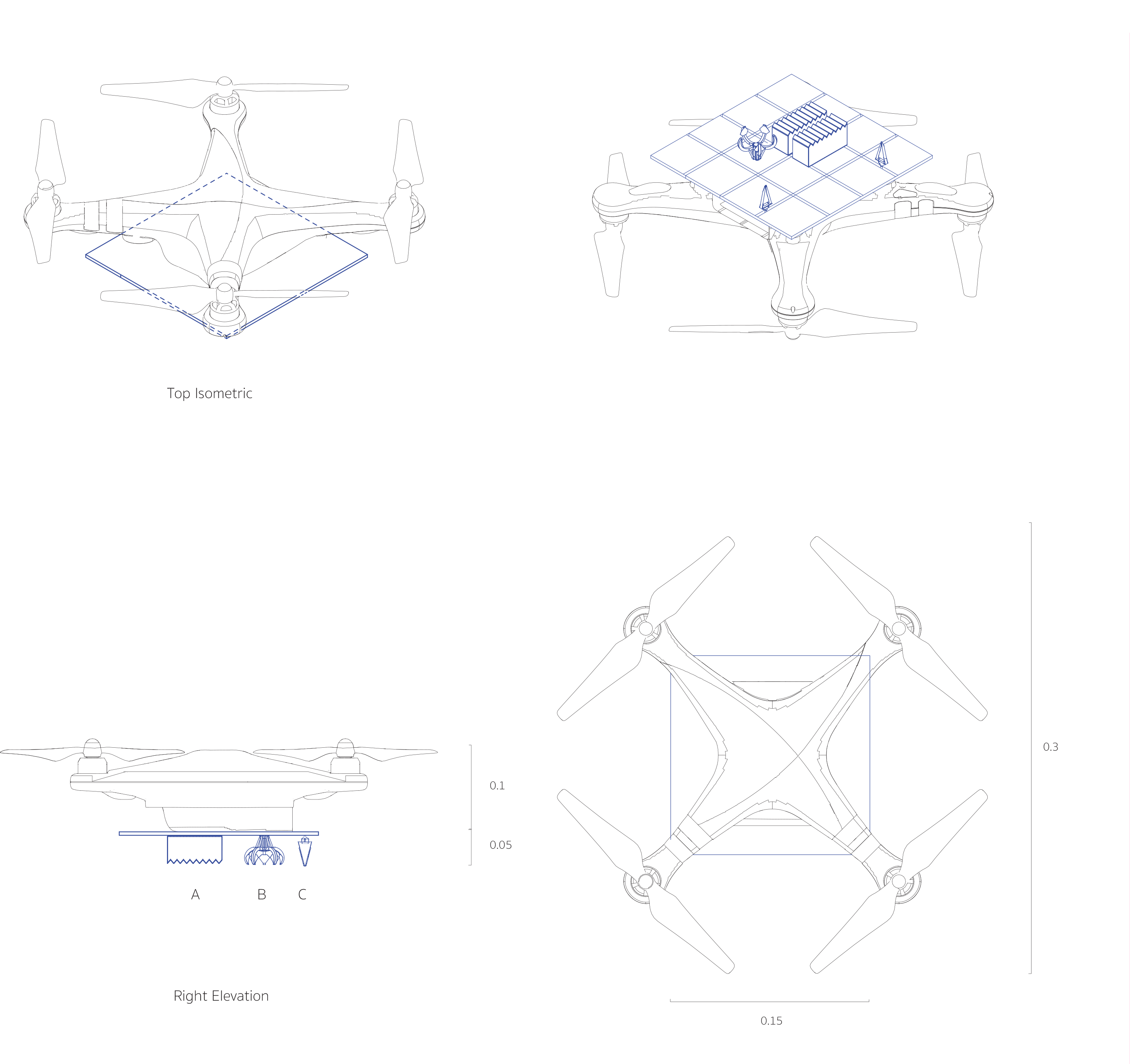 To attach hooks for phase 1, create nodes for phase 2, and tie knots for phase 3, the UAV needs to work like fingers. This drawing outlines the three attachments designed to help the UAV conduct relevant movements. Each attachment helps replicate a finger movement clasping, pressing, and holding).