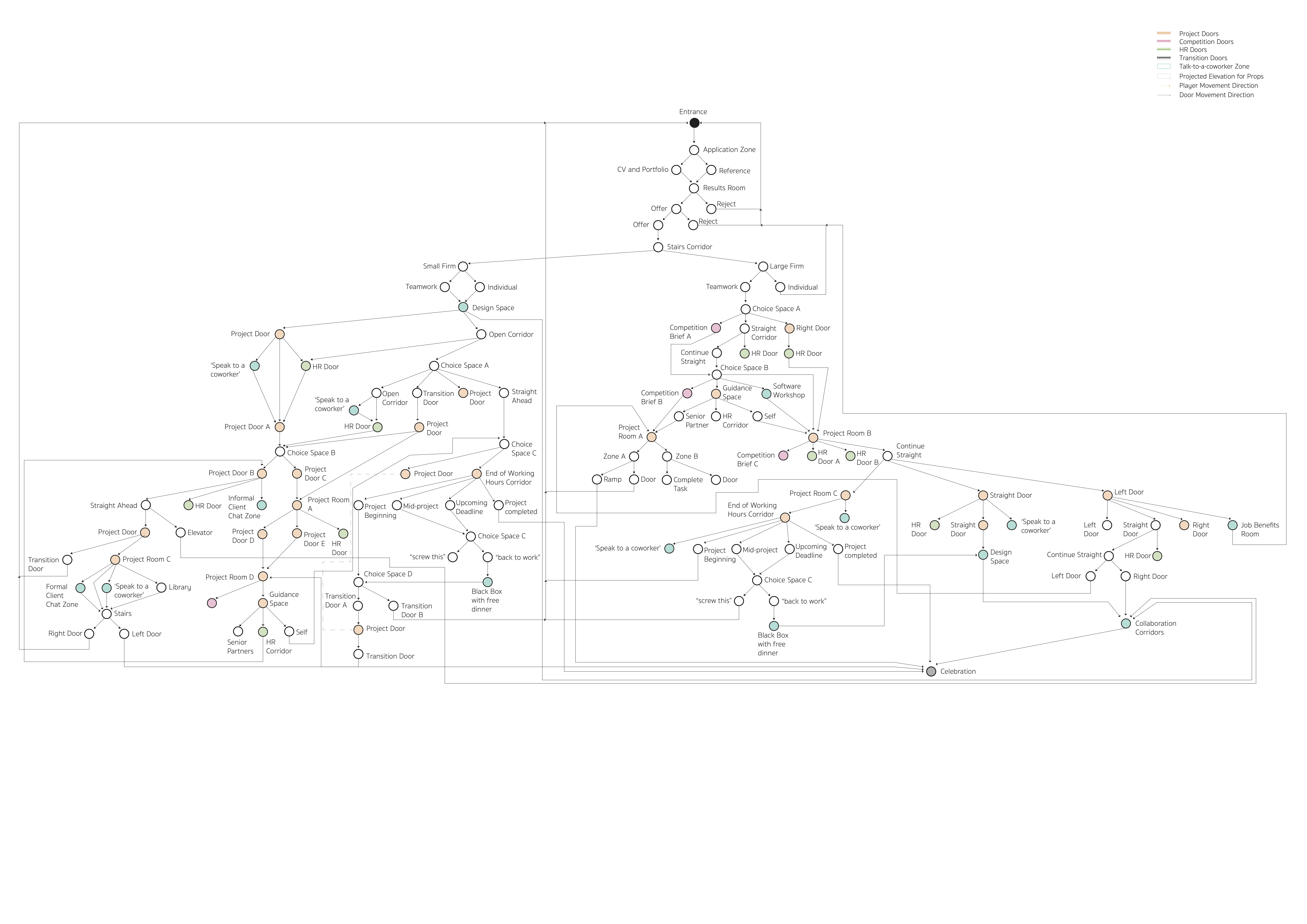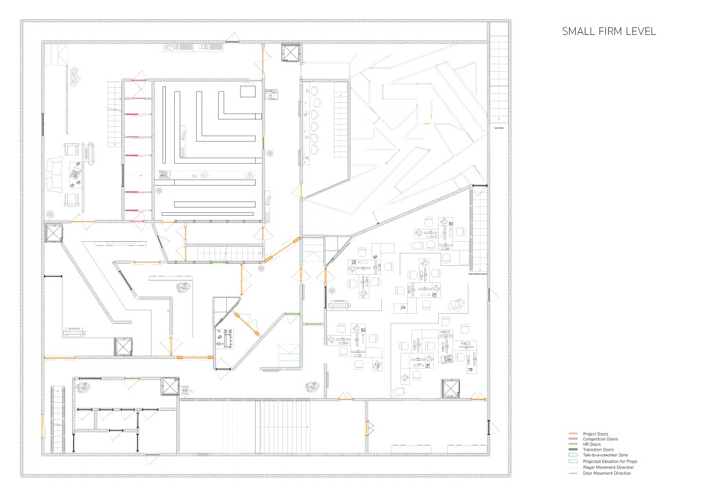 It builds upon the idea of choreographed temporality where specific areas can be arranged and deployed to create temporary spaces and corridors. Stairs and ramps are organised in a manner that players often cannot see the end-point. Doors are either iterative, chronological or unopenable. Corridors themselves are inhabitable and play on the notion of how players know there’s a path yet consciously have to make choices which can have repercussions. This proposal realistically also alludes to how gamification is divisive and unavoidable: it masks existing complexity.