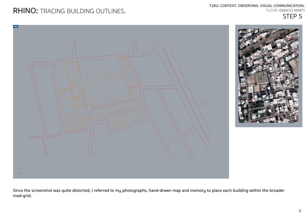 Since Rajkot is a small city, there were no ready 2D or 3D maps available. Hence, the process to create this drawing began with a physical site survey, transitioned to recreating the neighborhood from scratch on Rhino 7, and ended with adding details on Illustrator 2021.